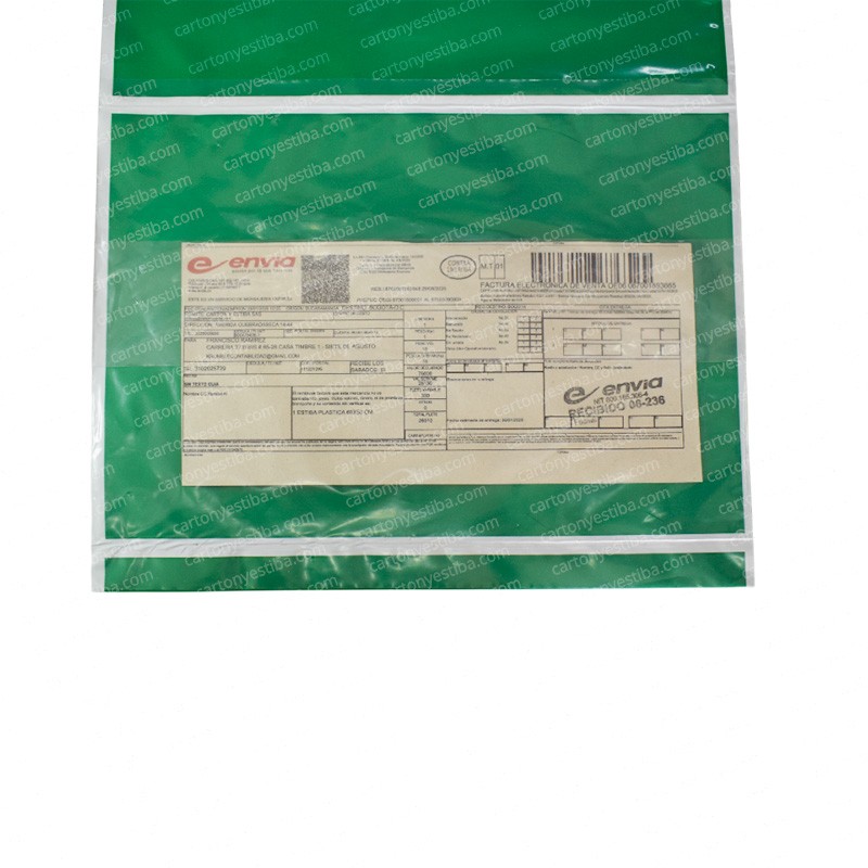 Bolsa plástica en polietileno de baja densidad (PEBD). Coextruido en 2 capas (Blanco/Negro), con adhesivo Hot-melt y con bolsillo porta guía transparente. Ofrece buenas propiedades mecánicas, buena fuerza por su sello lateral plano, buena resistencia al rasgado y resistencia a la punzadura.