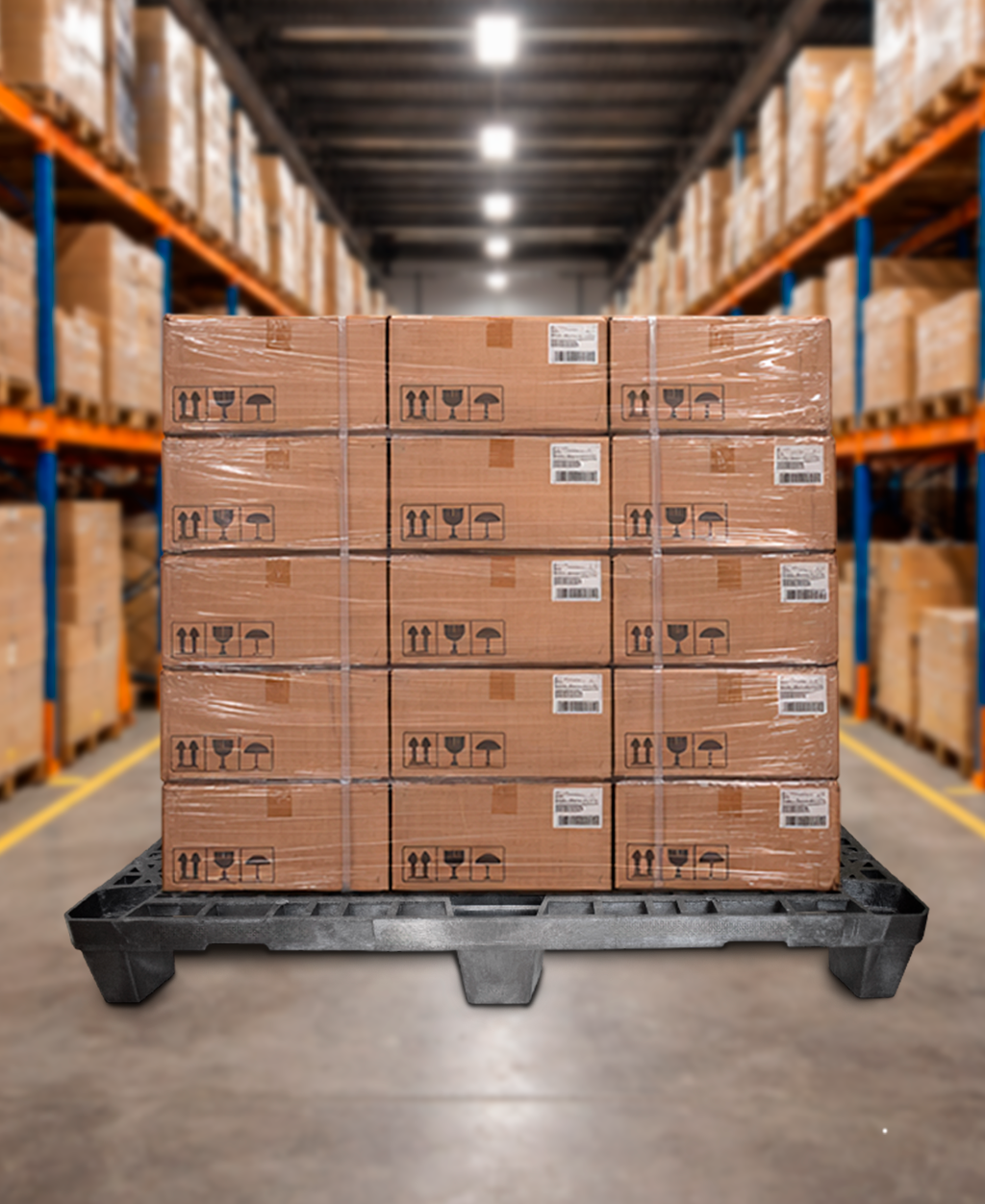 Estiba fabricada con HDPE (Polietileno de alta densidad) reciclados y originales, aditivos anti-UV, aditivos para alto impacto y resistencia a baja temperaturas y colorantes aprobados por la FDA.