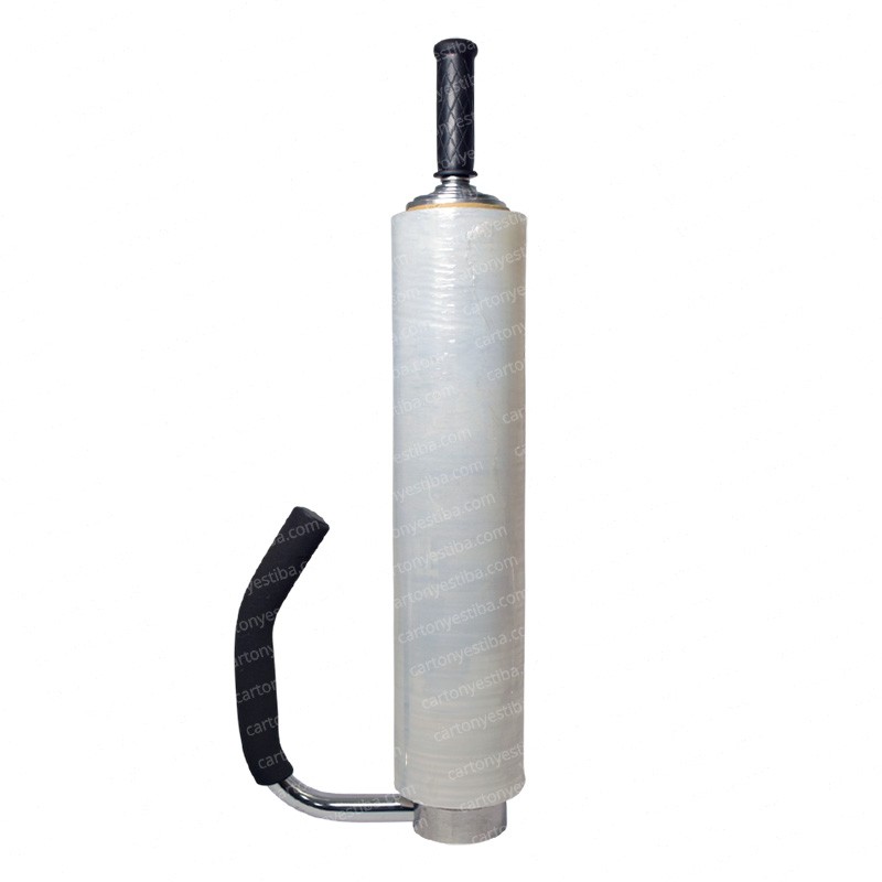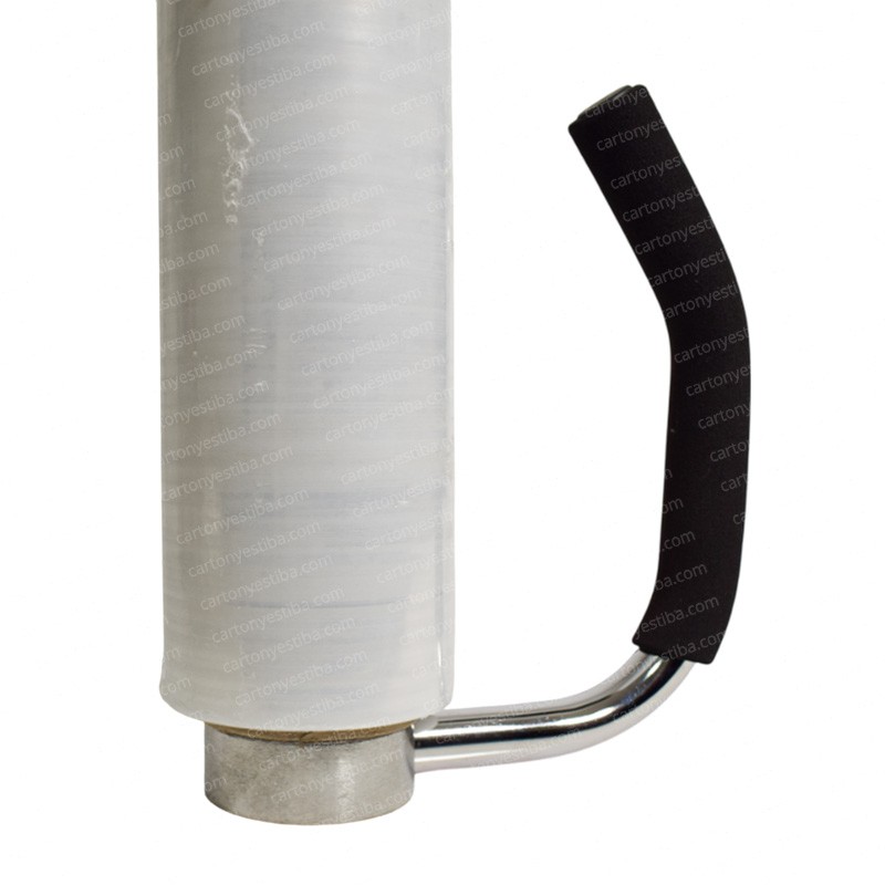 Dispensador de stretch metálico para core de 2″ y 3″, ancho de hasta 50 cm. Mango protegido con espuma y base en aluminio, con tensión ajustable.